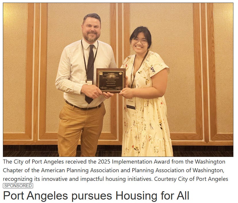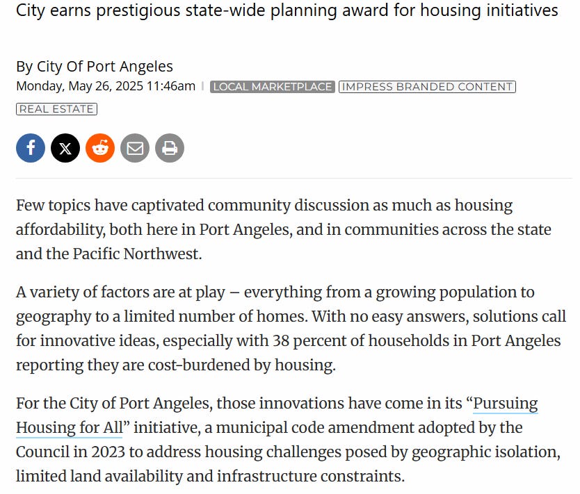 The City of Port Angeles recently published a glowing article—technically an advertorial—touting its “Pursuing Housing for All” initiative. The article concludes with a celebration of the City’s recent award from the American Planning Association. One paragraph reads: