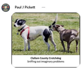 As scrutiny grows around Charter Review Commissioner Paul Pickett’s push for a Water Steward bureaucracy in county government, the heat seems to be getting to him. Pickett reportedly dubbed this publication the “Clallam County Crotchdog.”