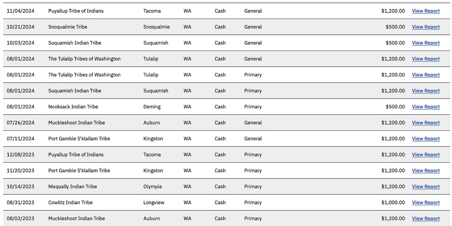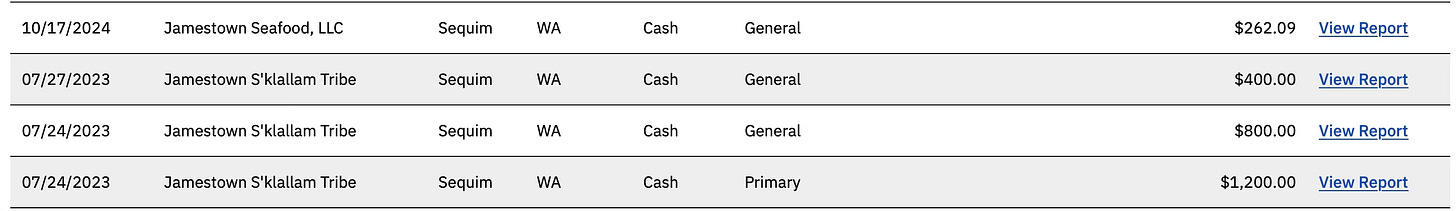 Campaign finance records from the 2024 election also show that Senator Chapman’s campaign received contributions from Jamestown and other tribal interests—perfectly legal donations that are common in Washington politics.