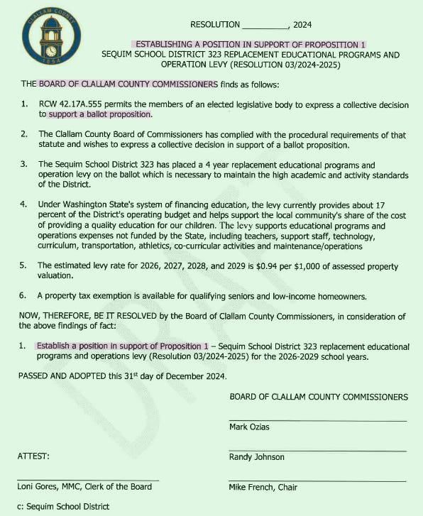 County government had some role in that increase, though commissioners have pointed out that some of the biggest spikes came from voter-approved measures. The commissioners themselves, however, strongly supported those measures—backing levy lid lifts for Olympic Medical Center, which continues to struggle financially, and passing resolutions supporting school bonds and levies in two districts. While officials now emphasize that voters approved the increases, it is worth remembering that the same officials encouraged residents to vote yes.