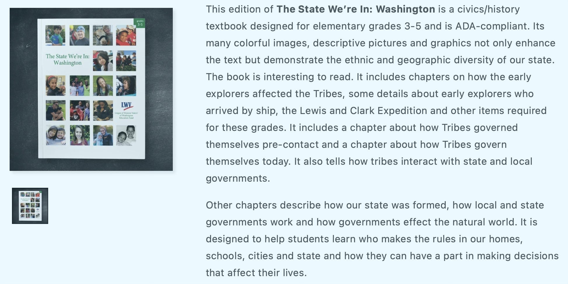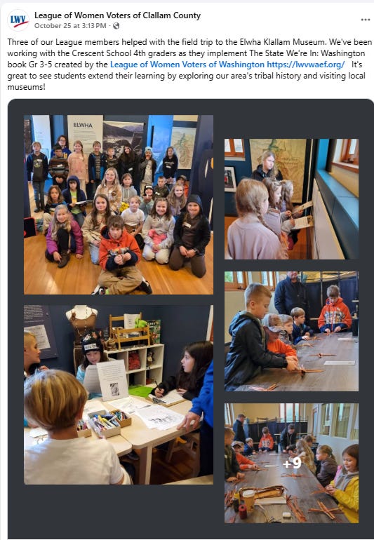 The League of Women Voters—an openly activist organization—recently took local students to the Elwha Klallam Museum after teaching lessons from its civics book, The State We’re In (Grades 3–5). The book is endorsed by the Washington State Indian Education Association and is referenced in Washington’s Since Time Immemorial tribal curriculum.