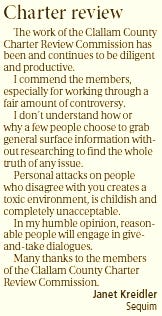 Not everyone thinks the Charter Review Commission spent the year sidelining dissent and prioritizing special interests. Janet Kreidler wrote to the Peninsula Daily News praising the Commission as “diligent and productive,” and condemning what she described as “personal attacks.”