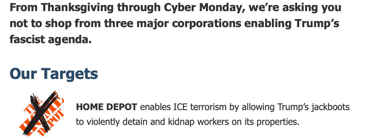 Indivisible issued a hardline Thanksgiving-to-Cyber-Monday directive: Do not shop at Home Depot, which they accuse of “enabling ICE terrorism” by allowing federal agents to arrest undocumented workers on its properties.