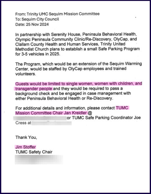 This isn’t Kreidler’s first appearance in CC Watchdog. Last year, a letter to the Sequim City Council referenced her as Mission Committee Chair at Trinity United Methodist Church—the same church where Commissioner Jim Stoffer serves as Safety Chair. That letter promoted the church’s “safe parking” program for women and transgender individuals.
