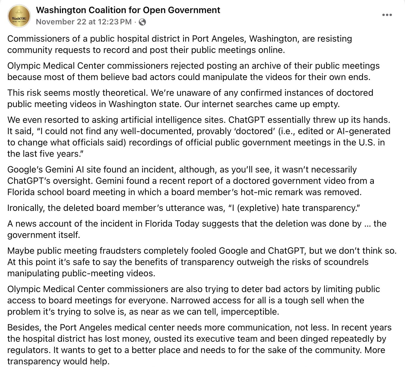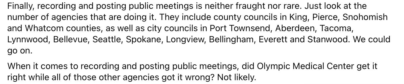 The Washington Coalition for Open Government highlighted an embarrassing reality: Olympic Medical Center commissioners refuse to post videos of their public meetings because the recordings might be “manipulated by bad actors.”