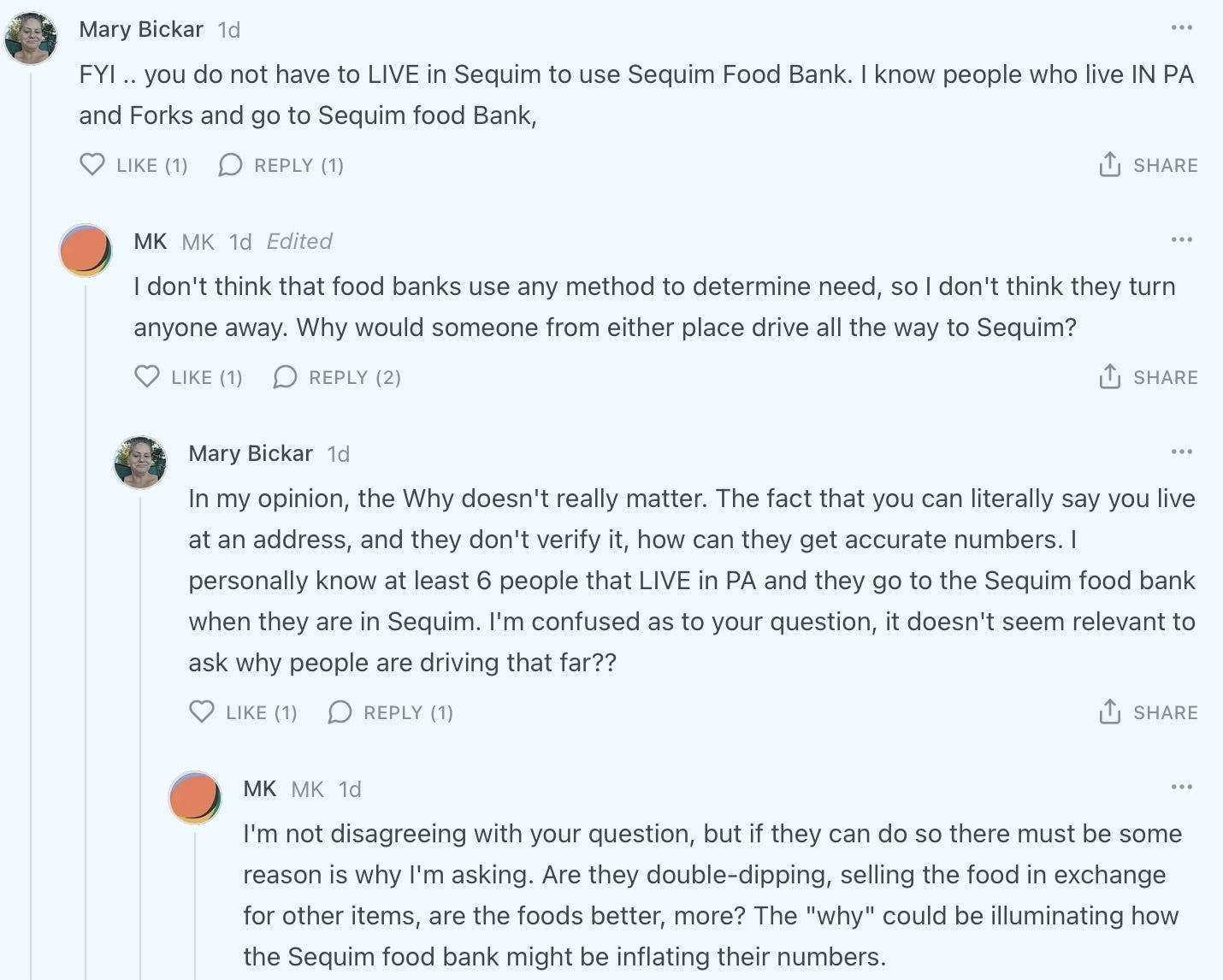 Commenters noted that residency is not verified and proof of income is not required, meaning residents from Port Angeles or Forks can—and do—use the Sequim Food Bank regularly.