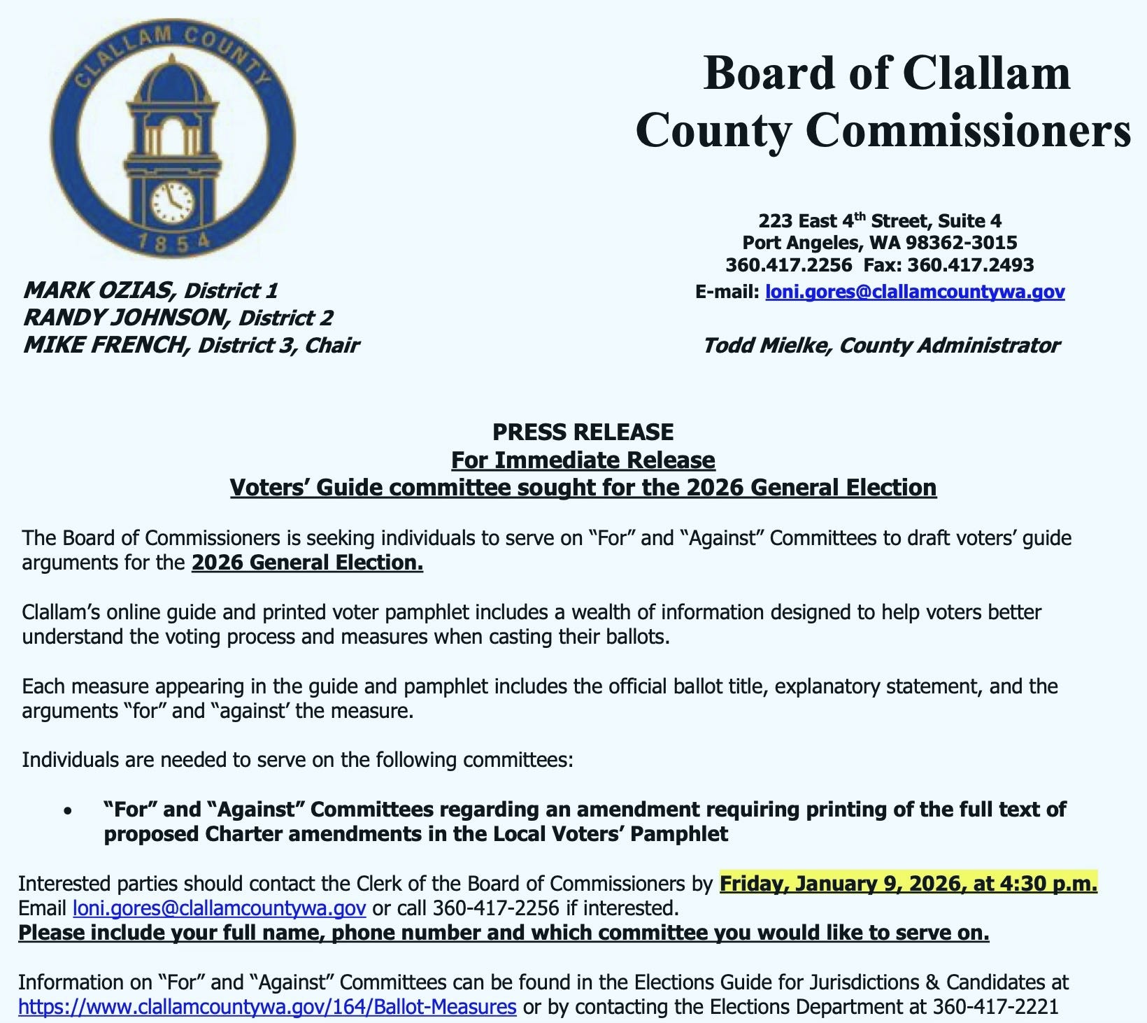 The county is now seeking volunteers for For and Against committees to write voter pamphlet arguments on a proposed charter amendment requiring the full text of charter amendments to be printed in the local voters’ pamphlet.