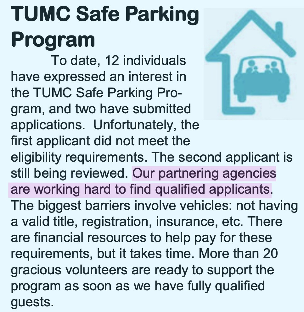 Twelve people have expressed interest. The first applicant failed eligibility requirements. The second is still under review. The primary barrier? Vehicles that lack valid titles, registration, or insurance. Sequim’s Trinity United Methodist has released a video of the safe parking site, but it’s hard to understand where the $118,000 is going.