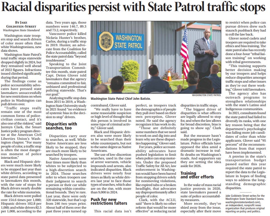 The Peninsula Daily News recently gave prominent coverage to racial disparities in Washington State Patrol traffic stops.
