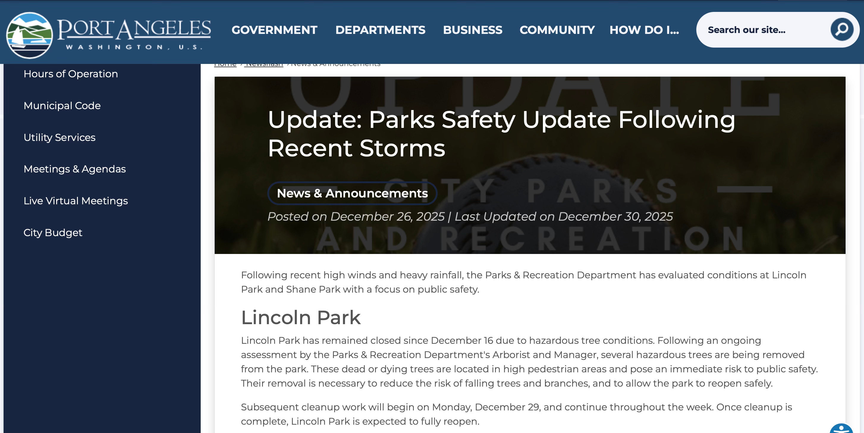 The City of Port Angeles issues public advisories when falling limbs pose a safety risk in parks. But residents hear nothing when needles are found near playgrounds, tents occupy family spaces, or registered sex offenders fail to report while living in encampments in public spaces.