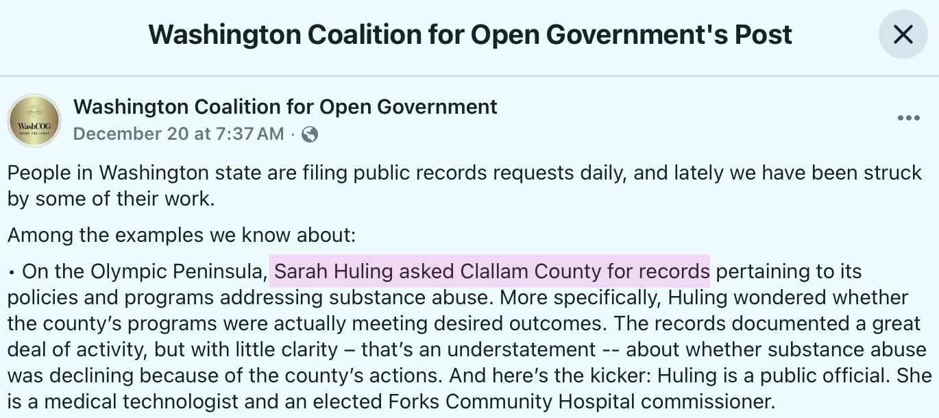 The Washington State Coalition for Open Government recently highlighted civic engagement across the state. On the Olympic Peninsula, Dr. Sarah Huling stood out.