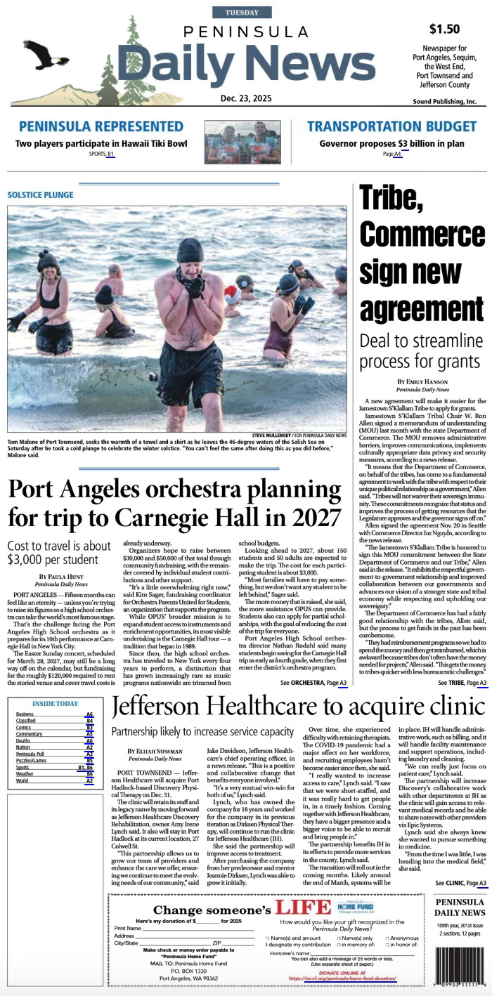 Out of 25 news headlines, only 7 were truly local. Those included coverage of a tribal–commerce agreement, a Port Angeles orchestra performance, Jefferson Healthcare’s clinic acquisition, a Boy Scouts recycling effort, Peninsula College auditions, and the announcement of new medical providers in Port Townsend.