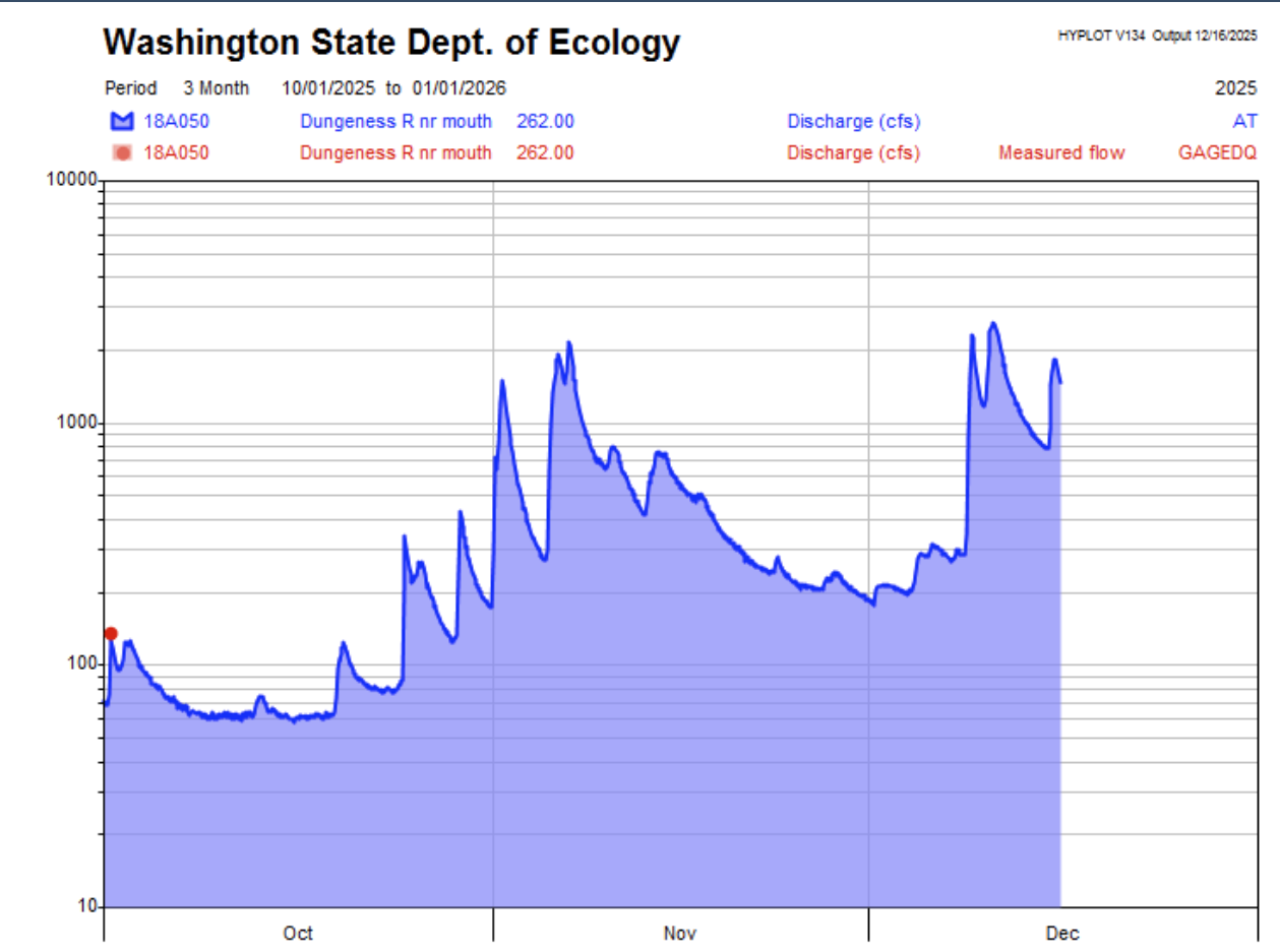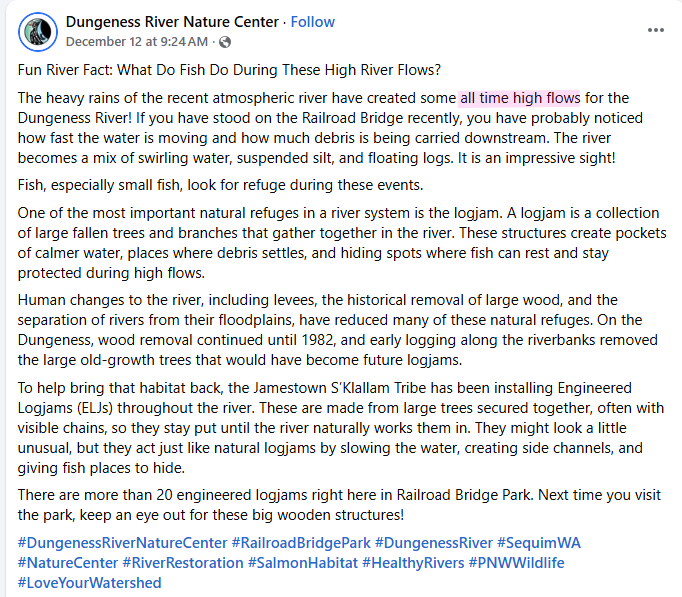 The Dungeness River Nature Center recently posted that “all-time high flows” had tested the river — crediting engineered logjams (ELJs) installed by the Jamestown Corporation for protecting fish habitat.