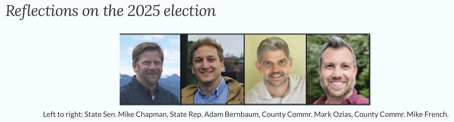 Two county commissioners recently sat down with Clallam Democrats Rising to reflect on the 2025 elections. Commissioner Mark Ozias used the opportunity to focus almost exclusively on national politics, praising candidates who are “not afraid to stand up to bullies” and calling for resistance to “entrenched power structures.”