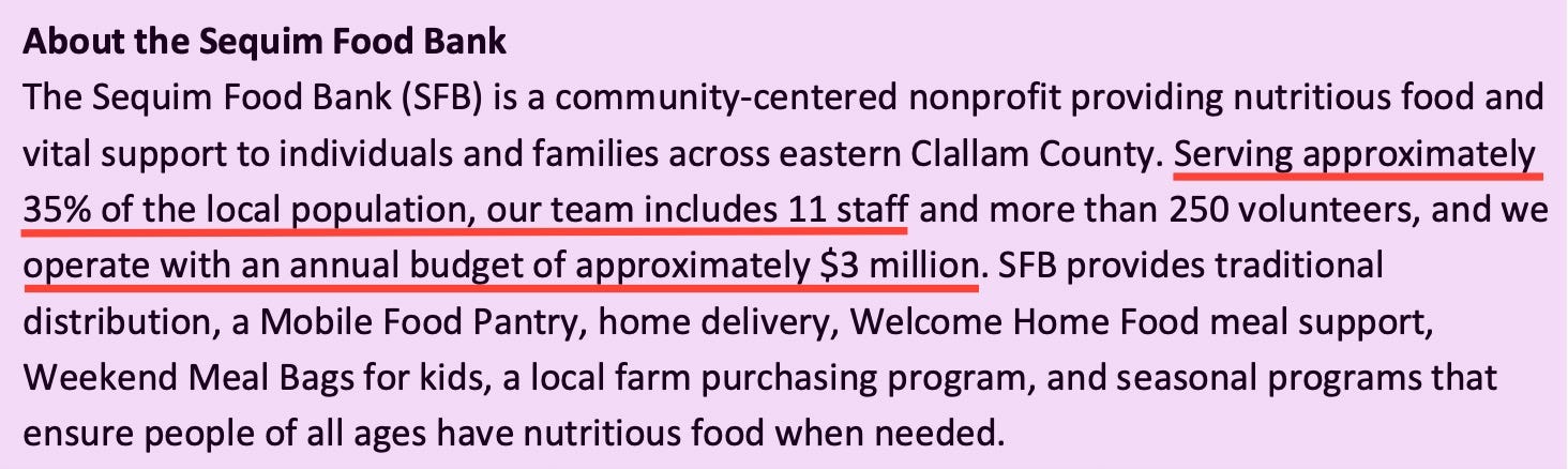 The Sequim Food Bank is searching for a new executive director — with a posted salary of $90,000–$105,000, extensive credential requirements, and responsibilities more consistent with a mid-sized corporation than a volunteer-driven charity.