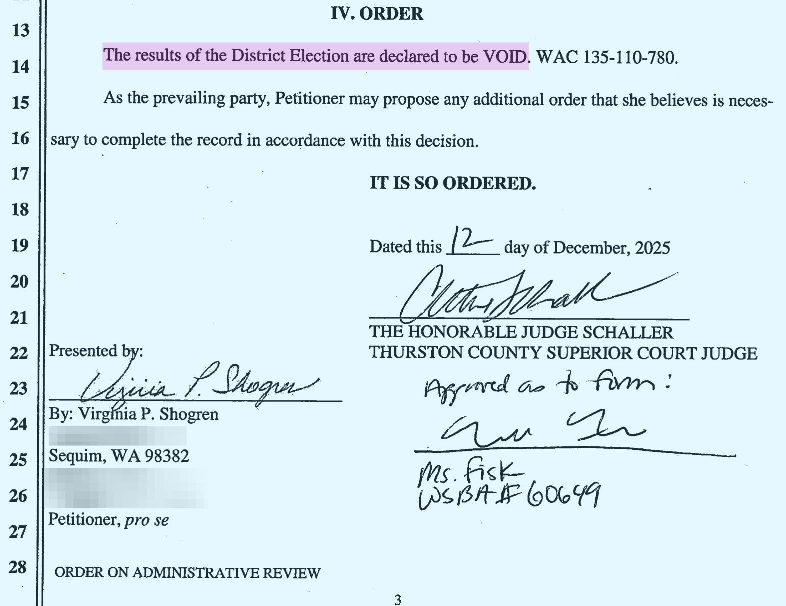 Shogren argues the sanction is less about misconduct and more about the subject matter — election integrity — noting that similar voter registration data is now being sought by the federal government in a separate lawsuit against the state. Shogren recently challenged a Clallam Conservation District supervisor election that a Thurston County Superior Court ruled was procedurally flawed. The election has since been declared void, underscoring that challenges to election processes are not theoretical, but local — and that raising them can cost significant time, money, and, in some cases, a person’s career.