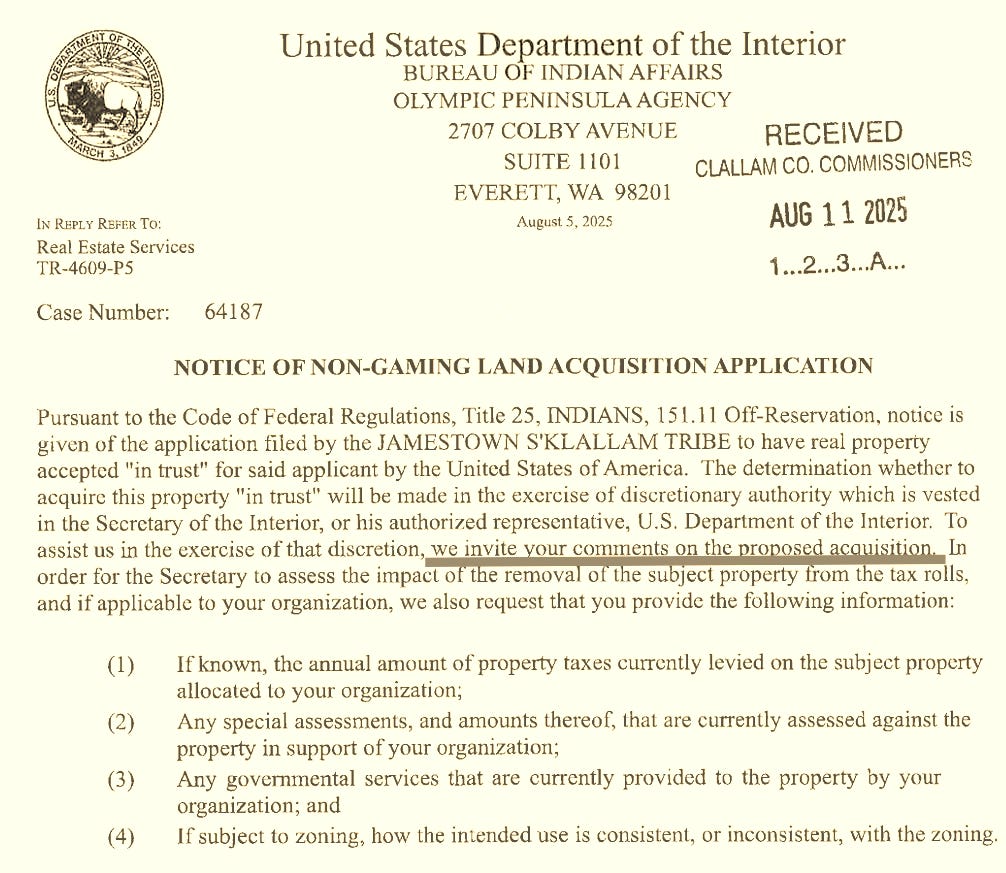 Think about that. Our elected commissioners openly admit they withhold comments to the federal government because they “support” the Tribe’s expansion. But they are not elected to represent the Tribe. They are elected to represent the people of Clallam County—the very people now being asked to pay more in property taxes to make up for the lost revenue.