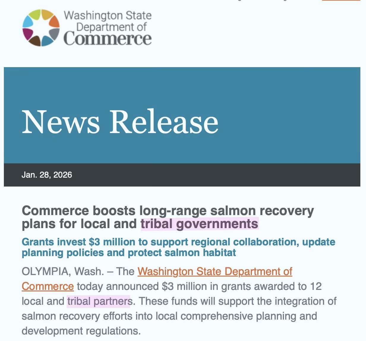 Commerce’s salmon recovery grants openly state they are funded by the CCA and emphasize tribal co-management.