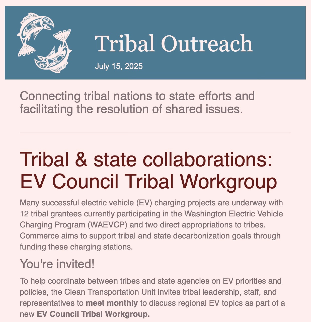 Commerce highlights tribal participation in EV charging grants and convenes a monthly Tribal Workgroup to redesign future funding—covering eligibility, timelines, and grant sizes.