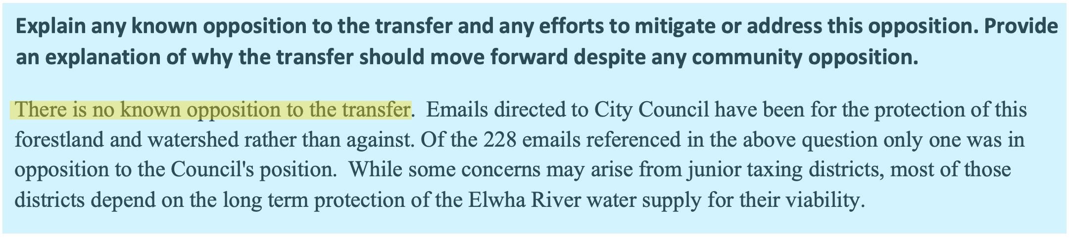 When the City of Port Angeles applied to transfer Elwha River forestlands from state trust to City management, its 2023 application claimed there was “no known opposition.” This was under Mayor Kate Dexter.