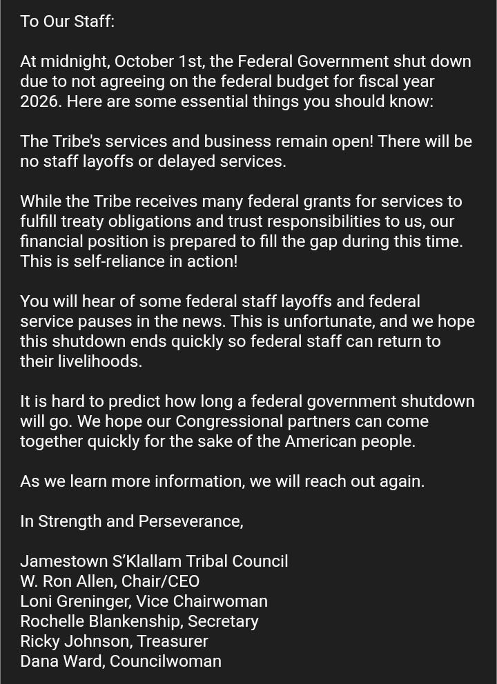 As a result of the government shutdown, the Jamestown S’Klallam Tribe, Clallam County’s second-largest employer, recently sent an email to staff declaring that, “While the Tribe receives many federal grants for services to fulfill treaty obligations and trust responsibilities to us, our financial position is prepared to fill the gap during this time. This is self-reliance in action!”