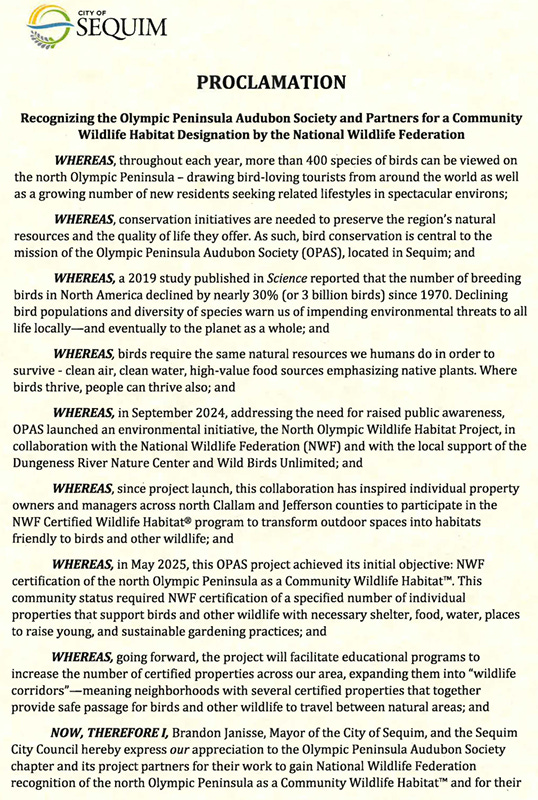 Instead of responding to this testimony, the Sequim City Council read a proclamation honoring birds.