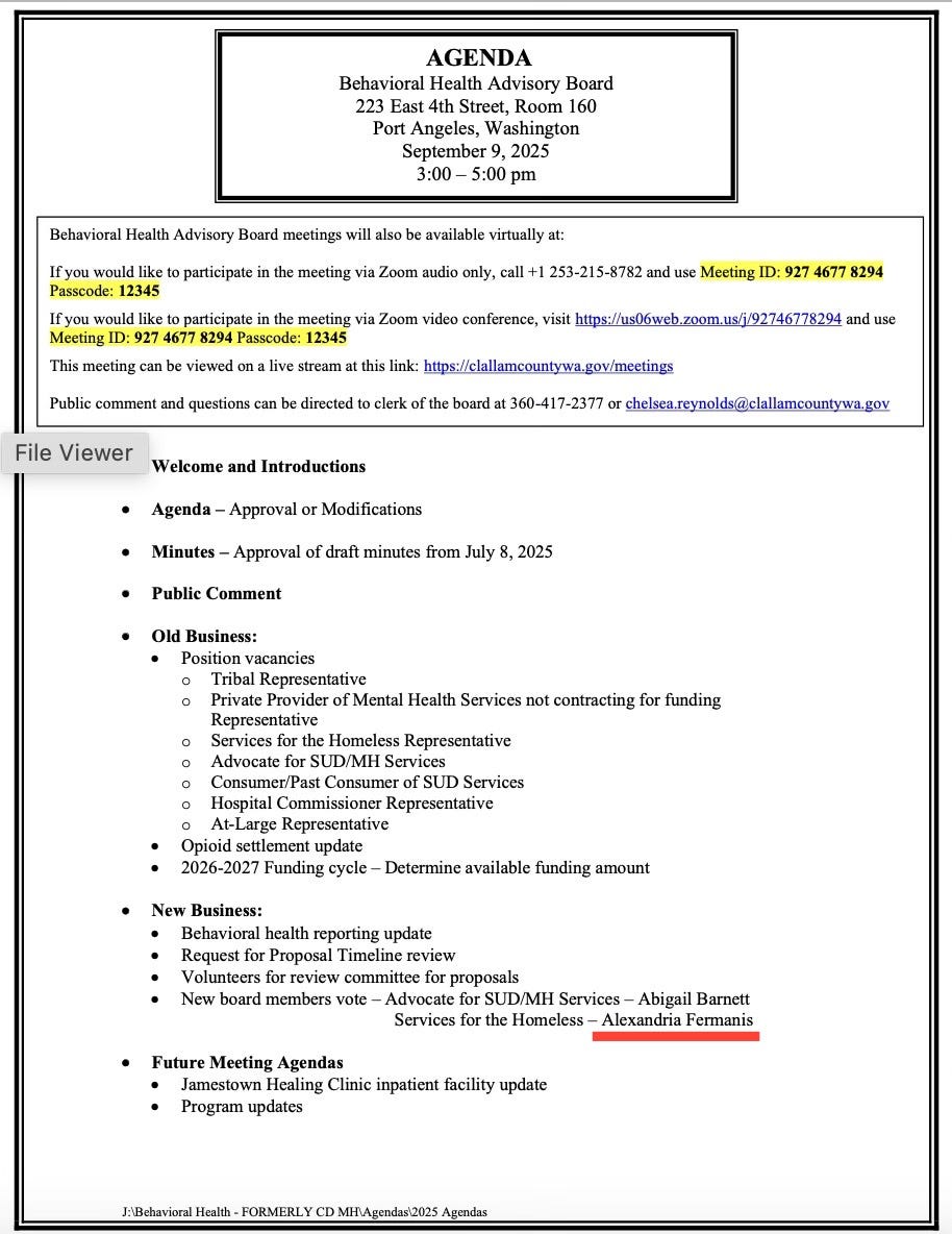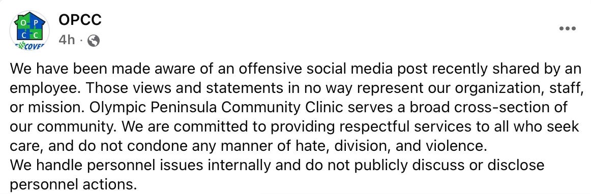 Just last week, Fermanis applied to serve on Clallam County’s Behavioral Health Advisory Board while employed at Olympic Peninsula Community Clinic (OPCC)—another organization that receives county support. OPCC issued its own statement disavowing the post: “We do not condone hate, division, or violence.”
