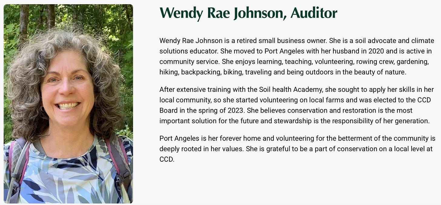 Another is Wendy Rae Johnson, currently the Auditor for the Clallam Conservation District, who publicly describes herself as a soil advocate and climate solutions educator.