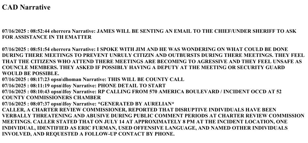 Narrative, 07/16/2025 08:07:37: “Caller, a Charter Review Commissioner, reported that disruptive individuals have been verbally threatening and abusive during public comment periods at Charter Review Commission meetings. Caller stated that on July 14 at approximately 8 PM... one individual, identified as Eric Furman, used offensive language, and named other individuals involved, and requested a follow-up contact by phone.”