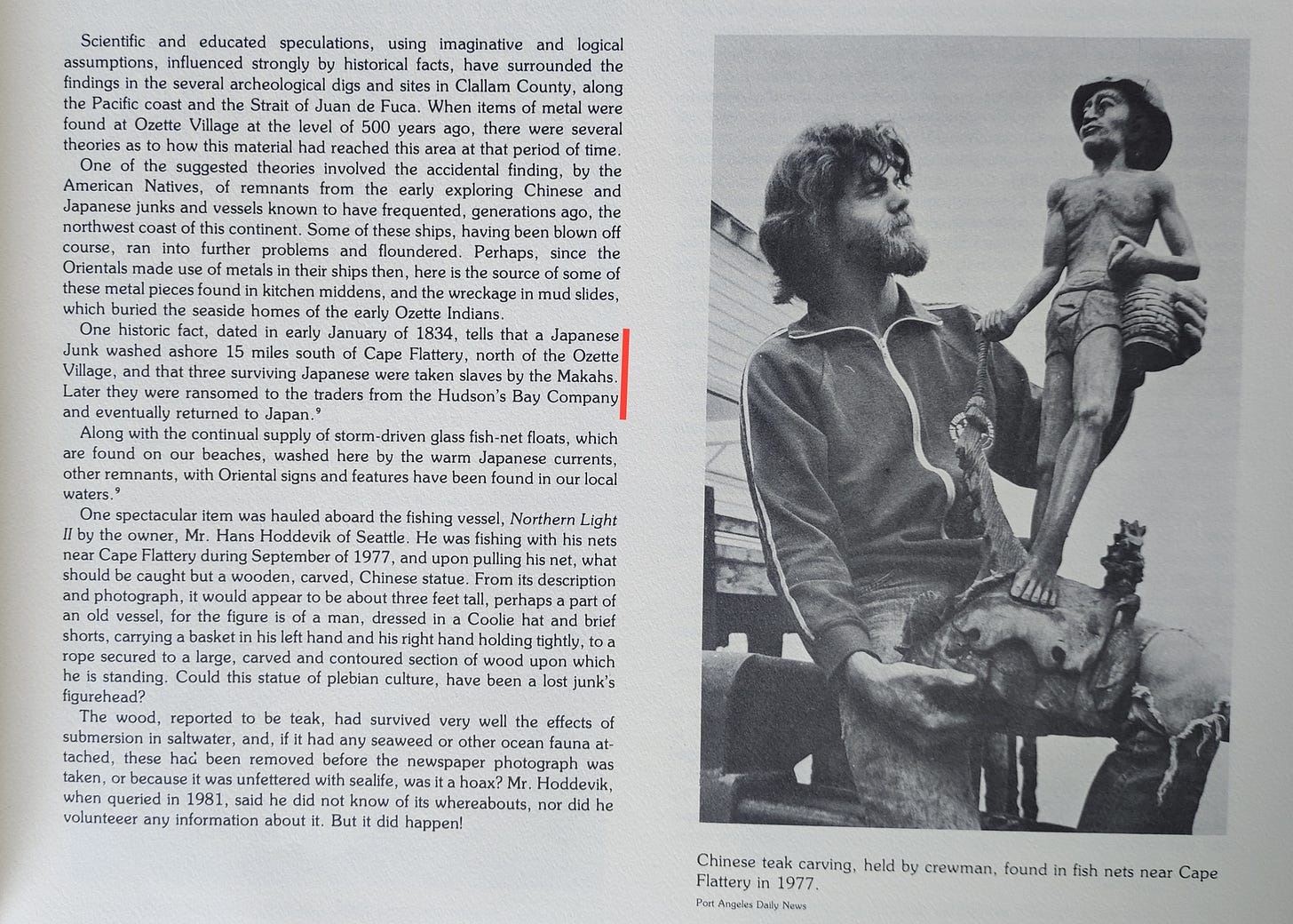 In 1834, according to local historian Harriet Fish in “Tracks, Trails, and Tales,” three Japanese sailors shipwrecked near Cape Flattery and were enslaved by the Makah before being ransomed to the Hudson's Bay Company.
