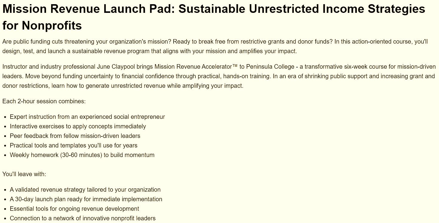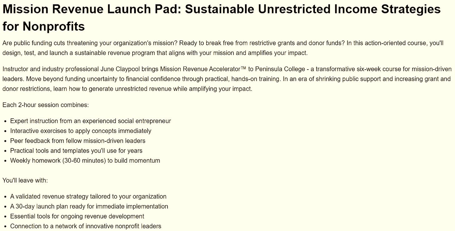 The $35 million RECOMPETE grant aims to reinvigorate the local workforce—but in Clallam County, even economic recovery is being monetized into a grant hustle. County Commissioner Mike French has floated the idea of using the funds to train tribal grant writers. Peninsula College is already in on it, offering classes like “Mission Revenue Launch Pad” to help nonprofits find ways to make unrestricted revenue from restricted funds.