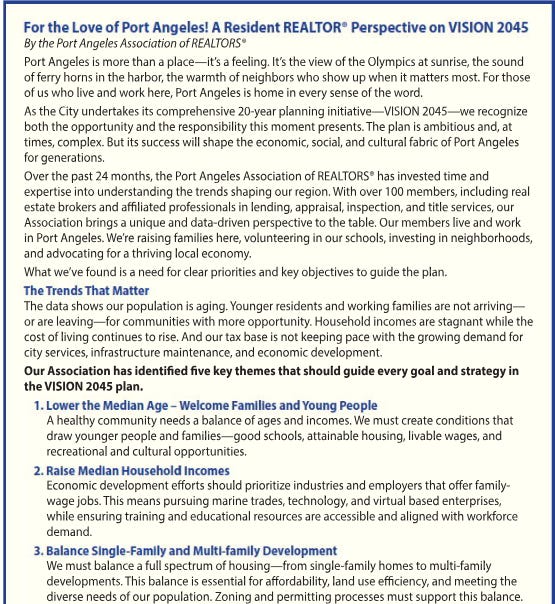 The Port Angeles Association of Realtors recently released “Vision 2045,” outlining hopes for a thriving, family-friendly community. But those goals clash with a reality where playgrounds are used for drug injection, city parks double as tent encampments, and public land disappears from the tax rolls as it’s absorbed by government agencies and tribal trusts.