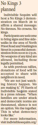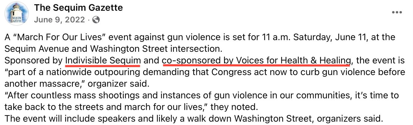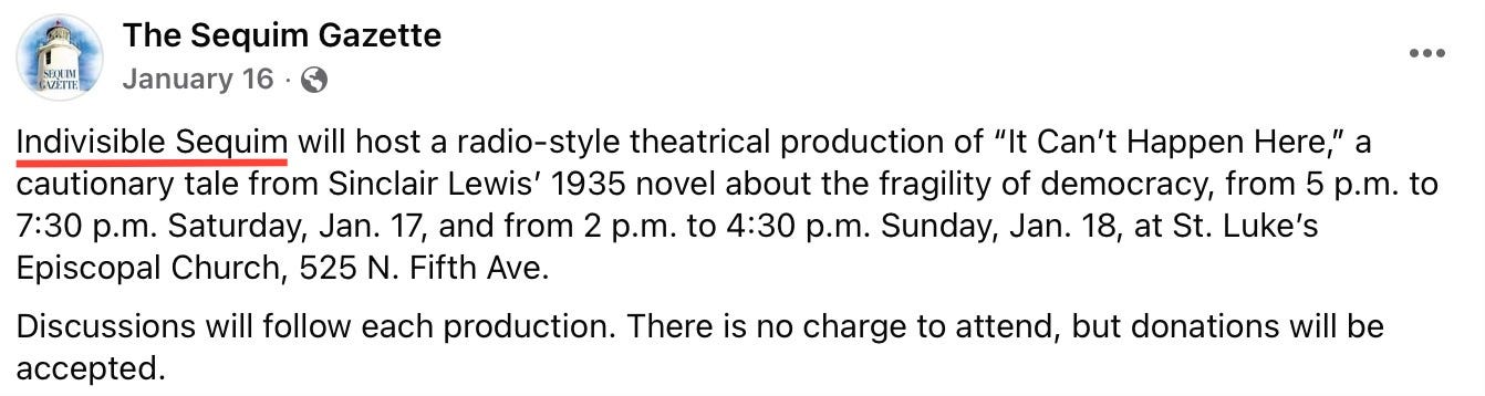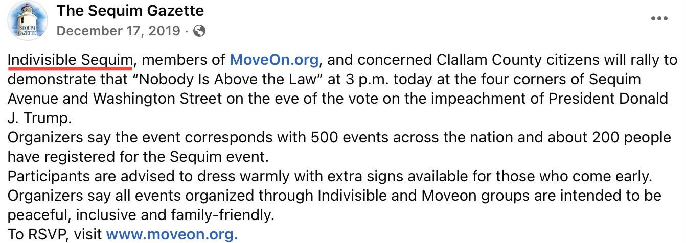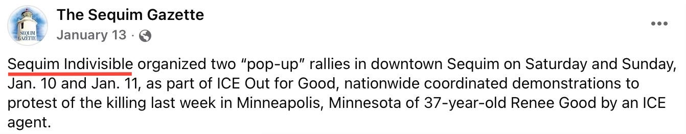 At the same time, coverage in the Sequim Gazette promoting an Indivisible Sequim protest appeared under the banner of community news—complete with messaging, framing, and quotes about defending democracy.