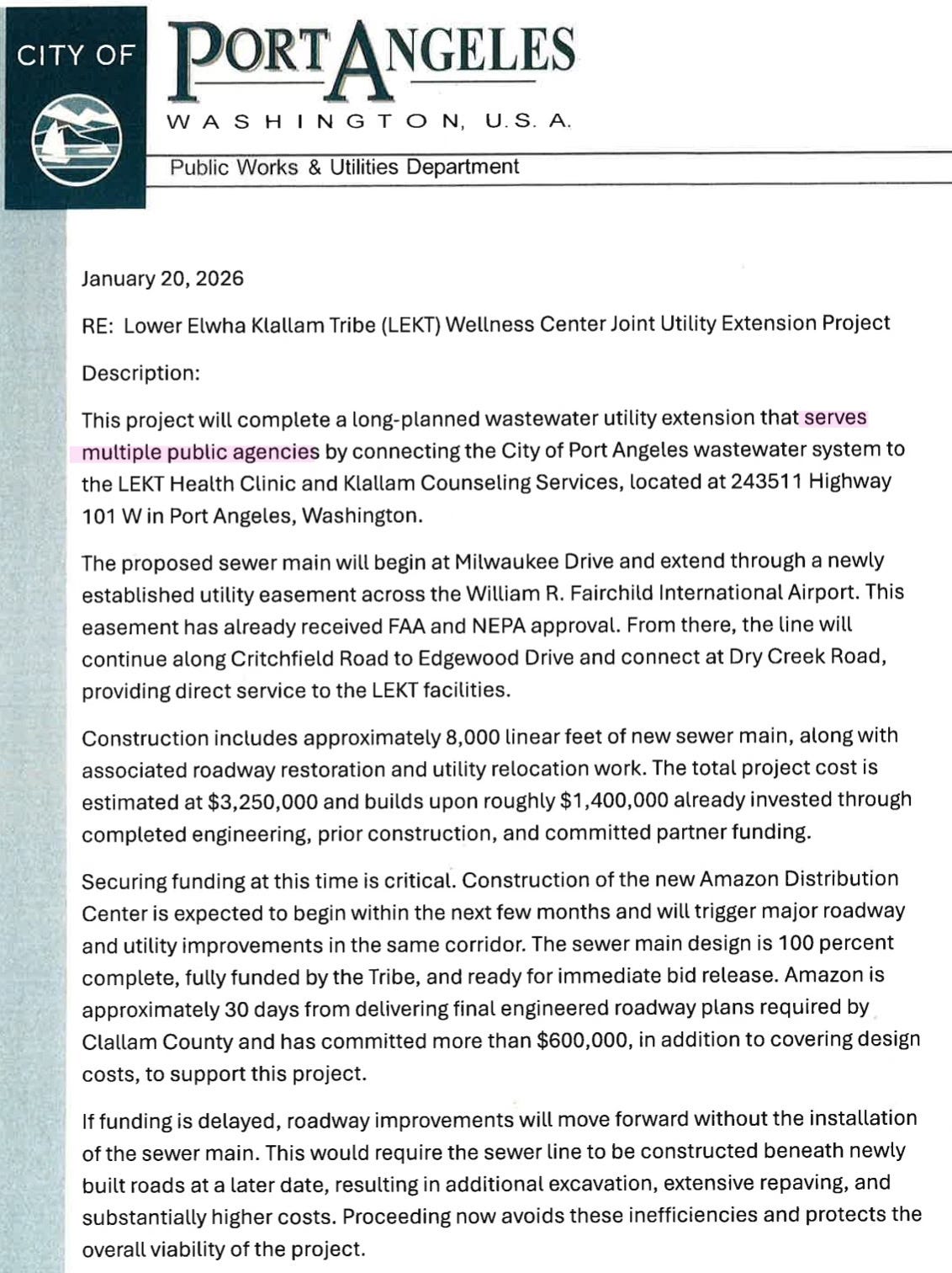 The money is actually going to the City of Port Angeles to extend wastewater infrastructure into the western Urban Growth Area. The Tribe’s facility will connect to it, yes. But so will a new Amazon distribution center. So will future high-density development.