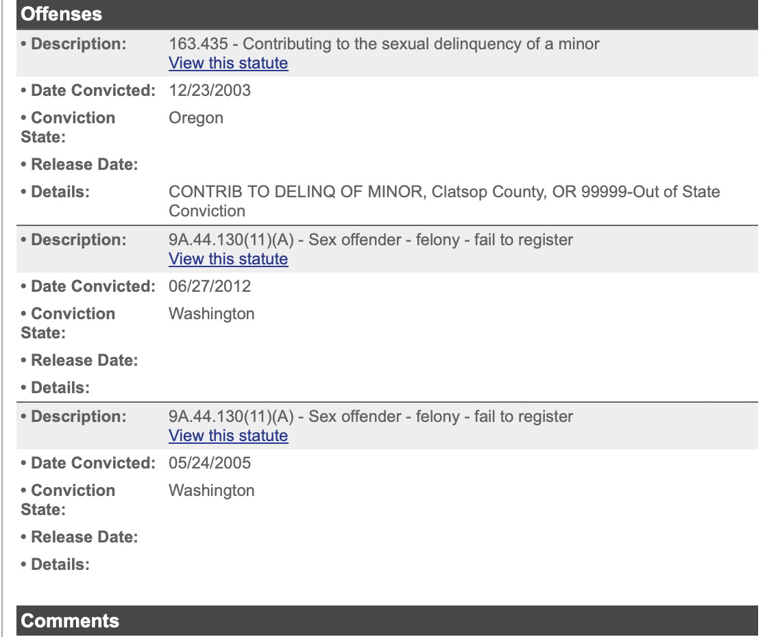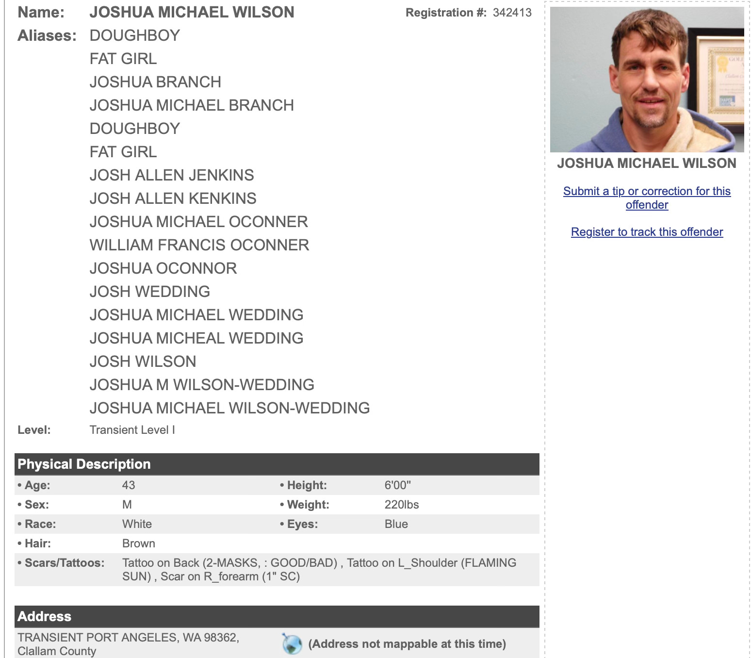 He’s also listed as a transient Level I sex offender, operating under more than a dozen aliases.