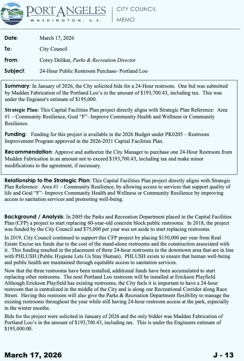 The City of Port Angeles is moving ahead with another Portland Loo—this one costing nearly $200,000 and to be installed at Erickson Playfield.