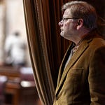 Behind her, the familiar faces of Indivisible protestors Jim Stoffer and Alex Fane watched from the gallery.