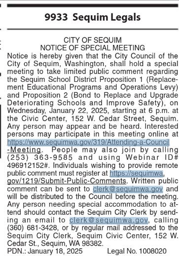 The Council’s special meeting was announced January 18th on page B7 of the Peninsula Daily News with only four days’ notice. Residents may not have opposed the Council’s actions because they didn’t read the fine print in the back of the newspaper.