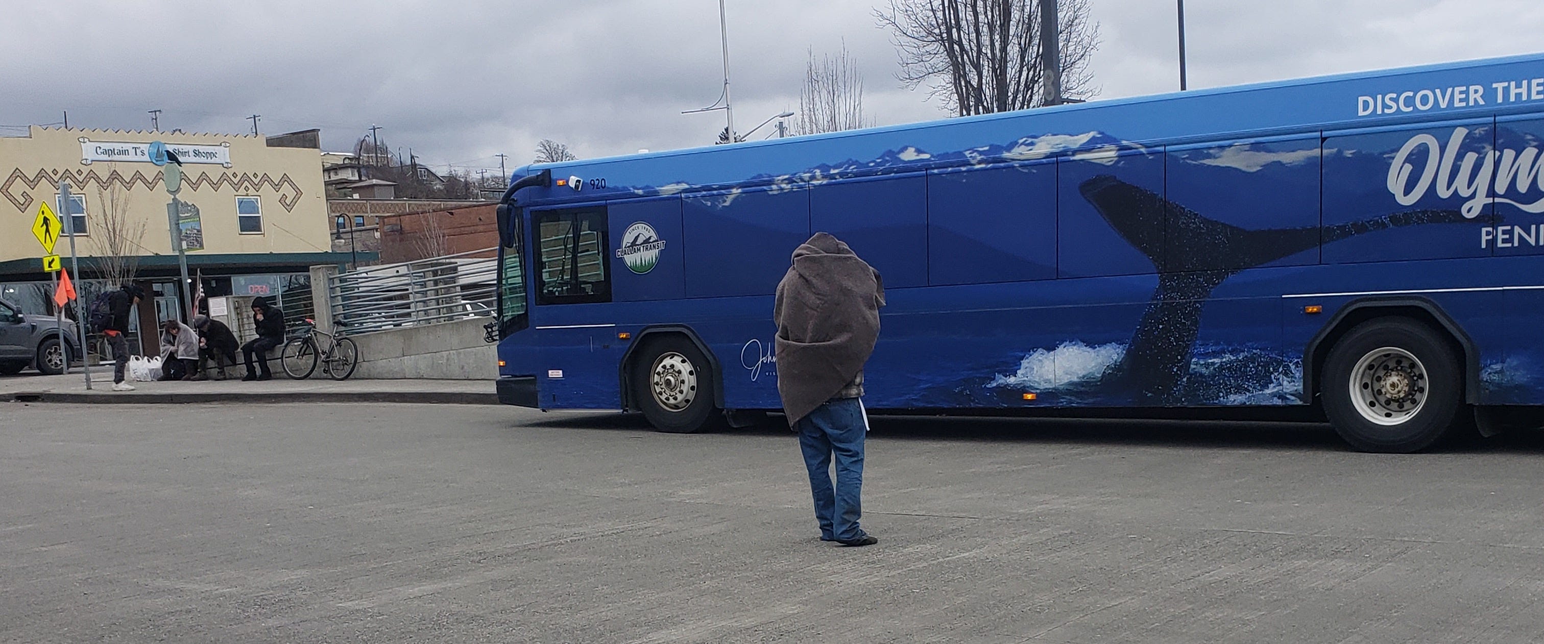 An eyewitness said he later appeared at the Port Angeles transit center and farmers market, wearing a blanket wrapped around his head, a scab on his nose oozing, and trying to provoke trouble.