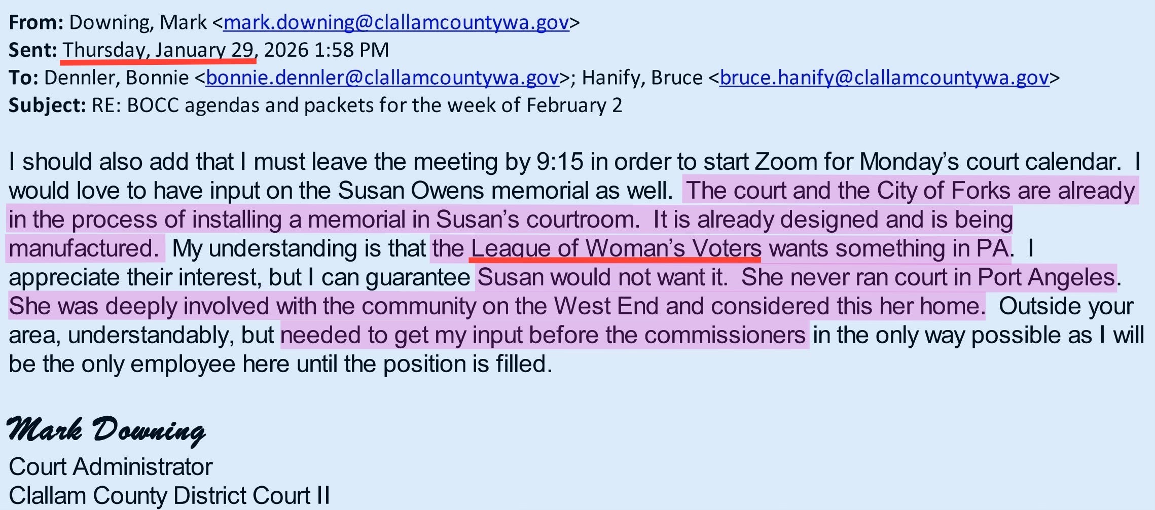 That explanation, however, raises obvious questions. Public records obtained by Denise Lapio show that six days before French publicly backed renaming the courthouse, the administrator for District Court II had already told the commissioners that a memorial was being designed, was in production, and that Owens herself would not have wanted the courthouse renamed.
