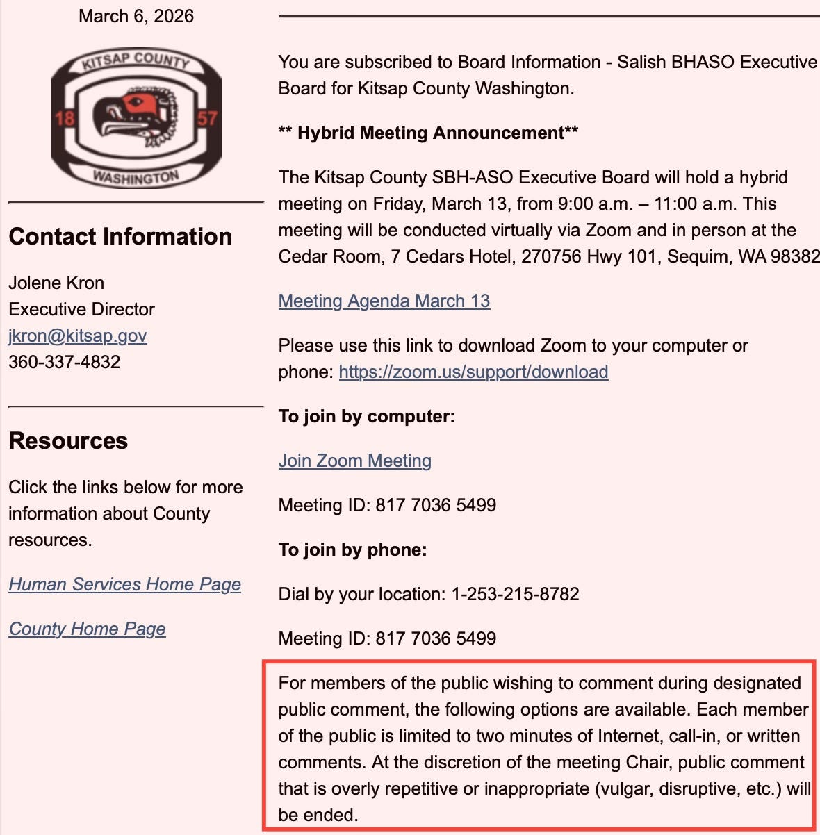 Recent meeting packets show the group holding hybrid meetings in Sequim, including at the Jamestown Tribe’s 7 Cedars facilities. That raises a fair question: when a public body responsible for major regional policy chooses to meet on sovereign tribal land, what protections do citizens have if disputes arise over speech, access, or decorum?
