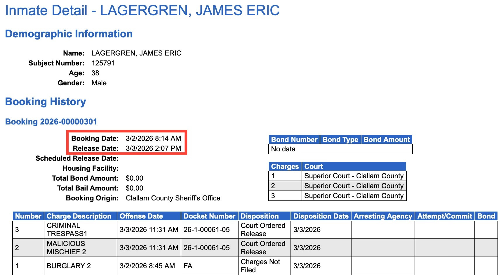 Remember the man reportedly terrorizing Carlsborg last week? He was booked Monday and released Tuesday, with one charge not filed and others court-ordered release.