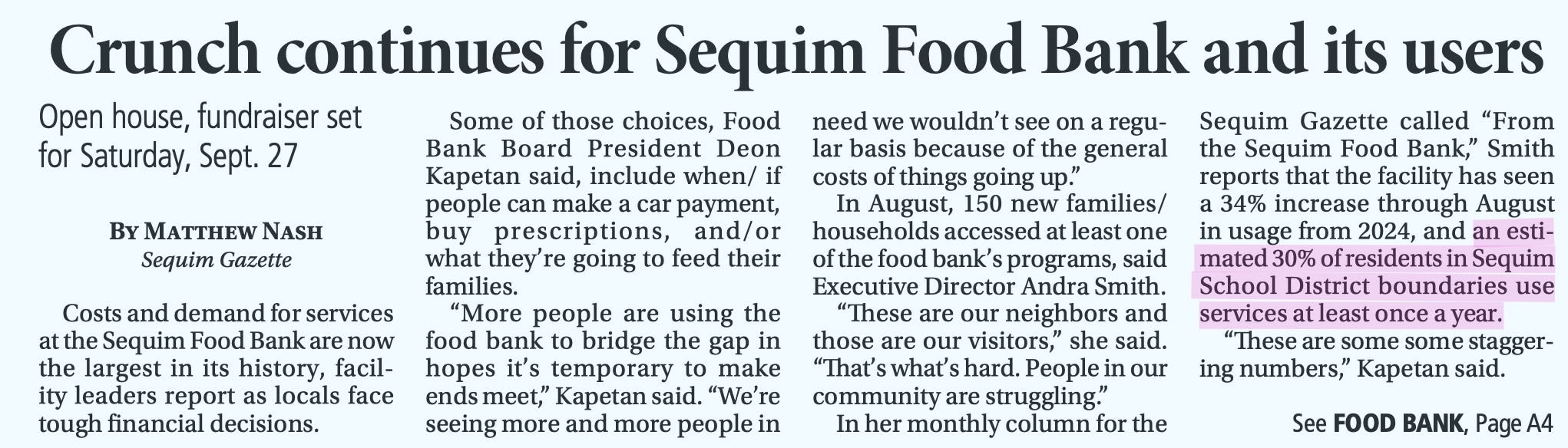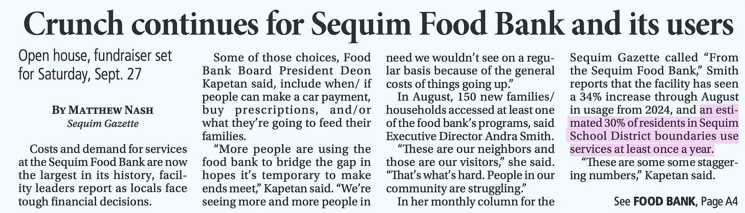 Last fall, the Sequim Gazette reported that the Sequim Food Bank estimated about 30% of residents in the Sequim School District area use its services at least once a year. That number has been repeated a lot in local conversations.