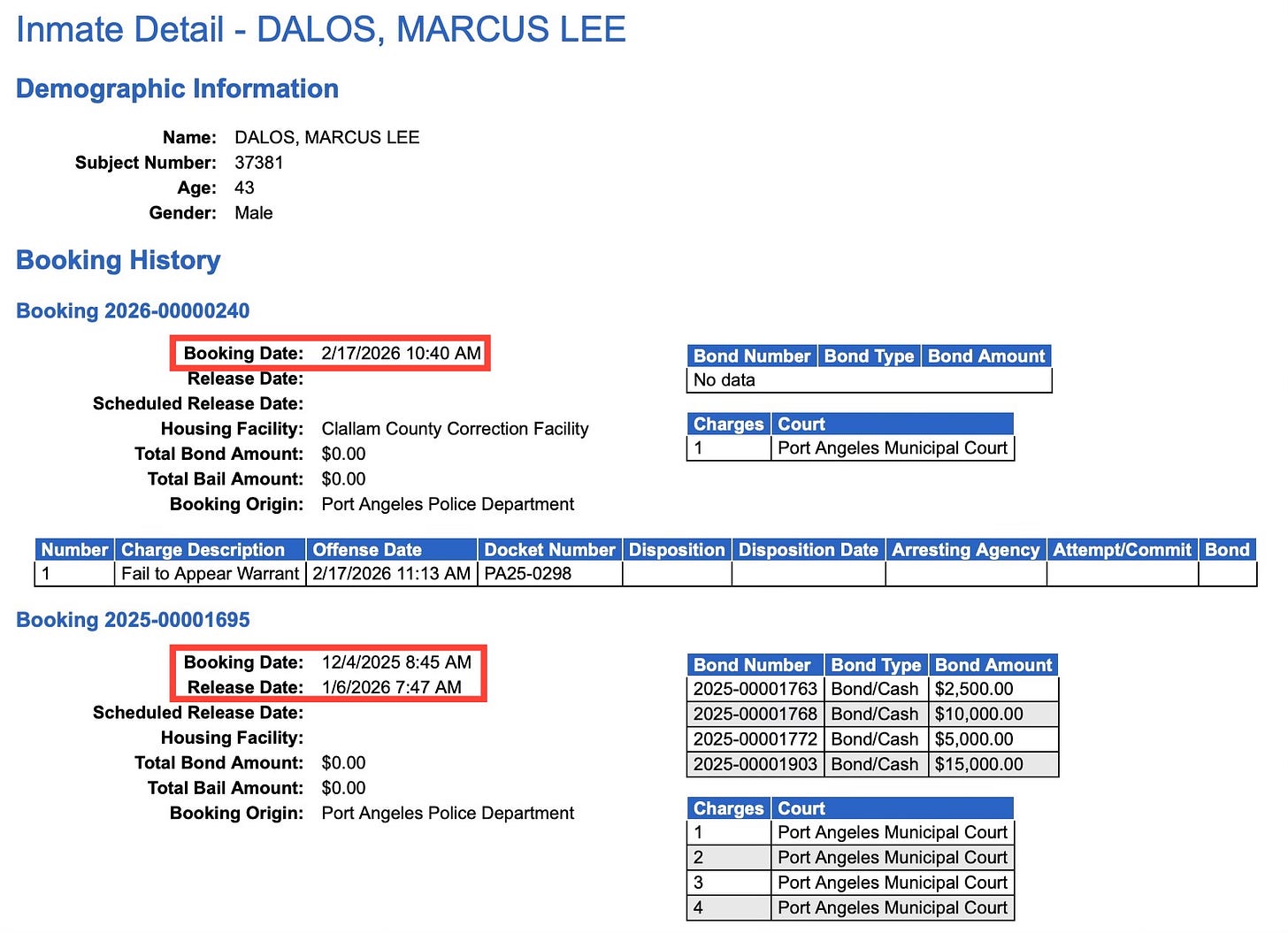 Convicted child rapist Marcus Lee Dalos continues cycling in and out of Clallam County Jail.