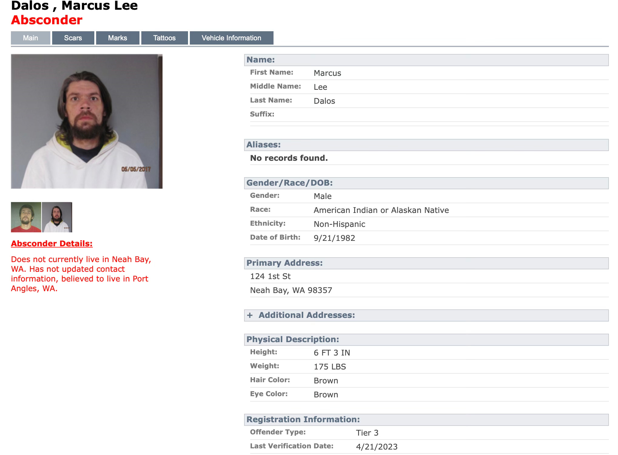 He is listed on the Makah Tribe sex offender registry as an absconder, believed to be living in Port Angeles.