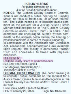 The Peninsula Daily News published notice of a public hearing to consider the renaming of the Clallam County Courthouse in honor of Justice Susan Owens.