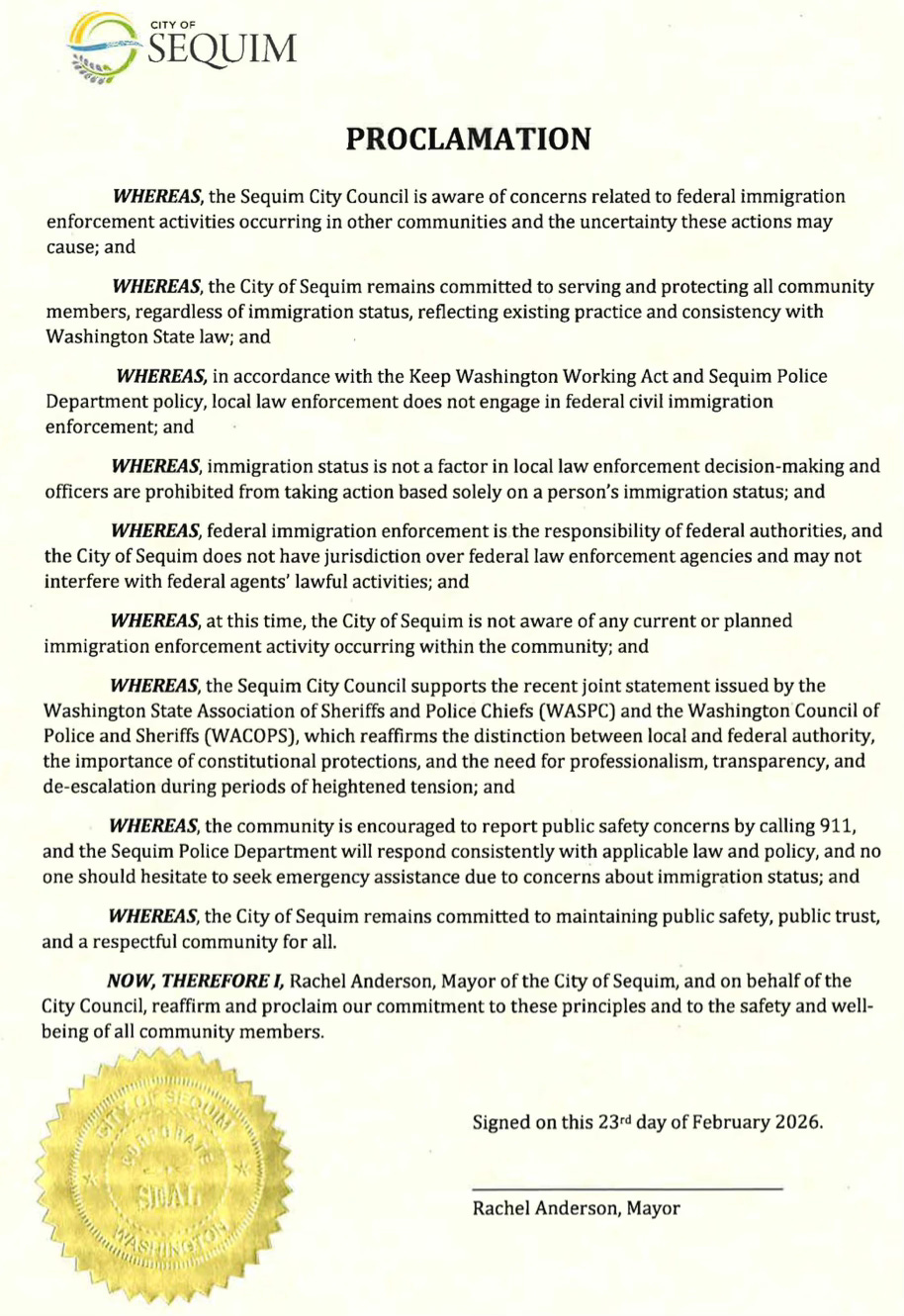 City officials have discussed “solutions” for over six months. Where are the priorities of the new mayor, Rachel Anderson? The Sequim Monitor reports that at tonight’s Sequim City Council meeting, she will issue a proclamation affirming that the City of Sequim “does not engage in federal civil immigration enforcement.”