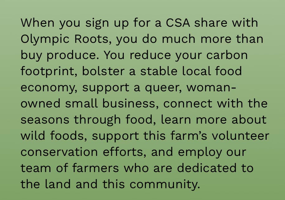 It’s worth noting that Olympic Roots is a CSA farm — a Community Supported Agriculture operation, built on the principle of supporting local community members while providing them with fresh, seasonal produce.