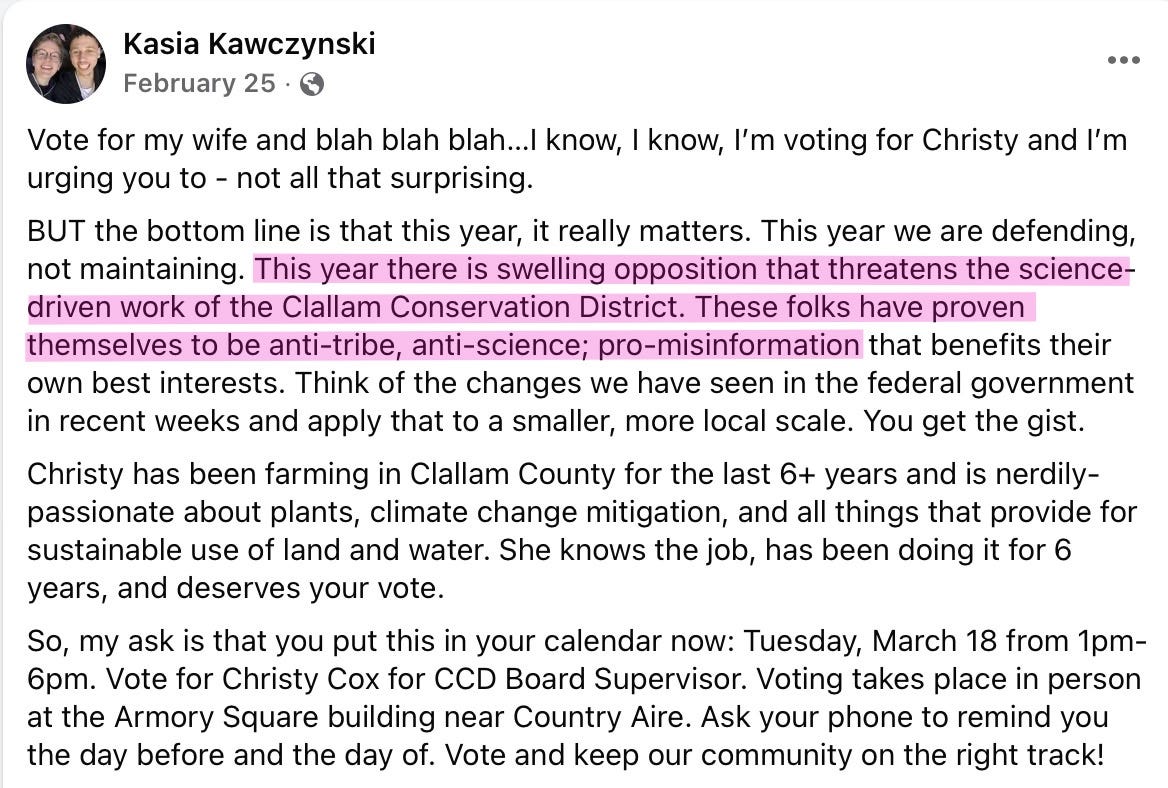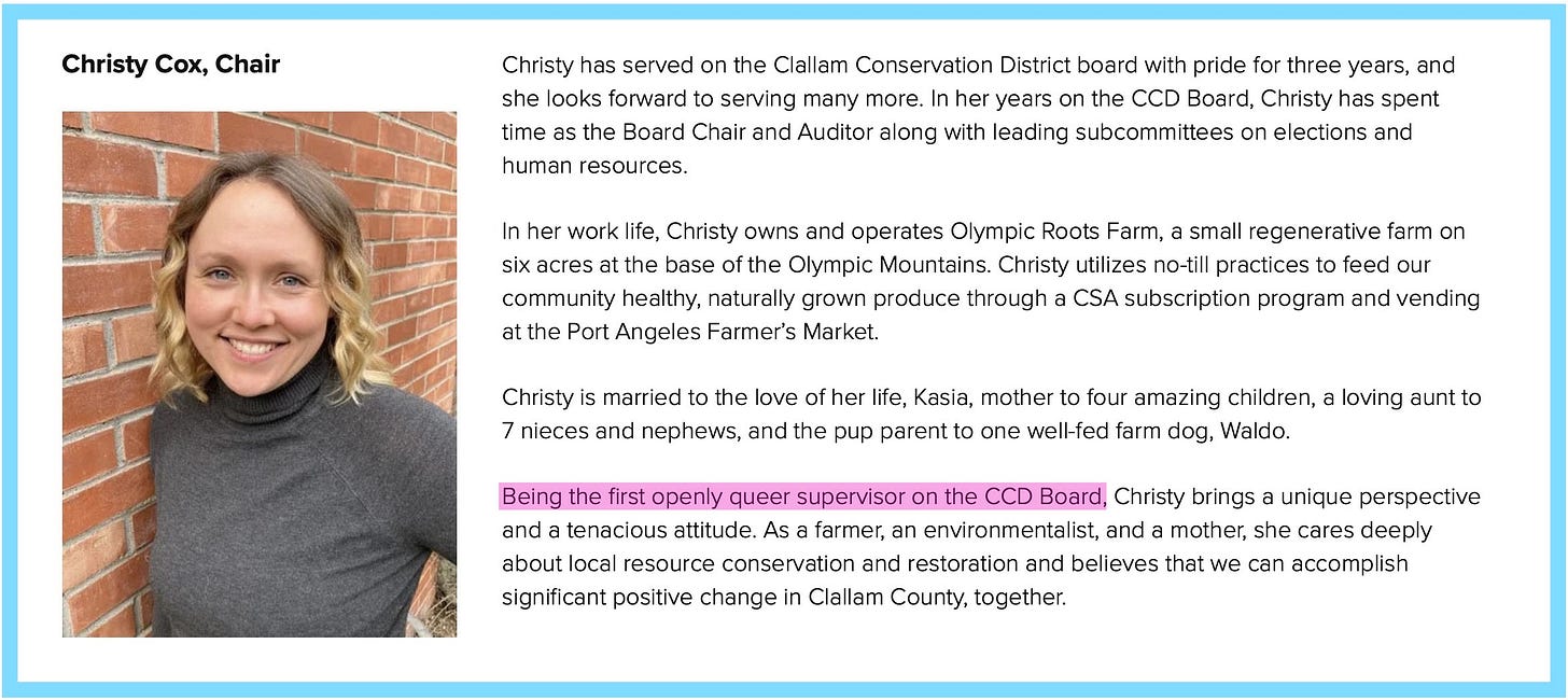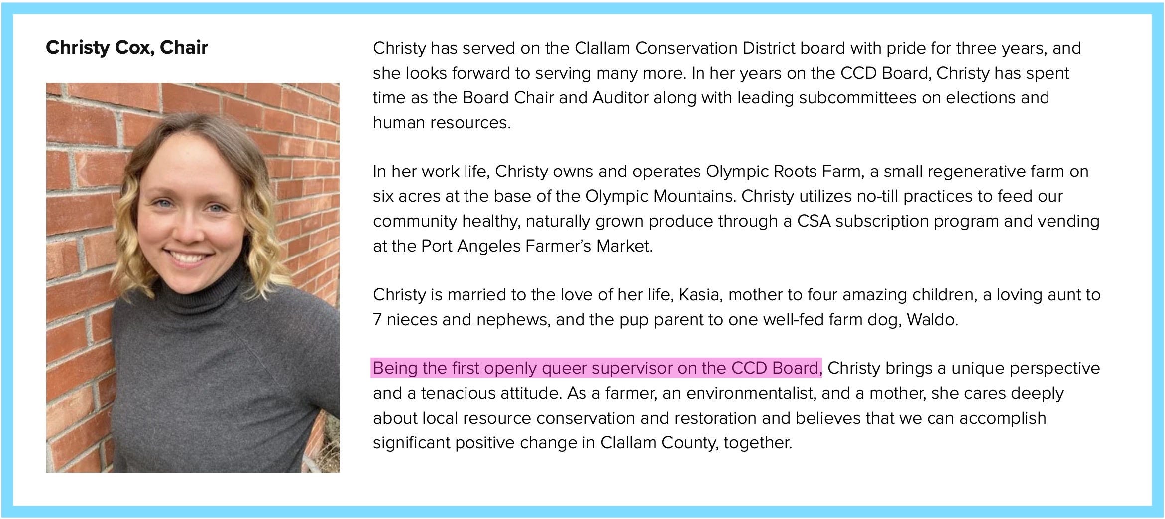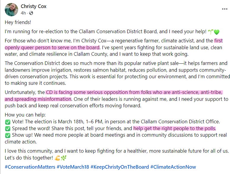 Christy Cox may be Chair of the Clallam Conservation District, but her behavior suggests that “community” only counts when it aligns with her terms. That’s not progress. That’s hypocrisy.
