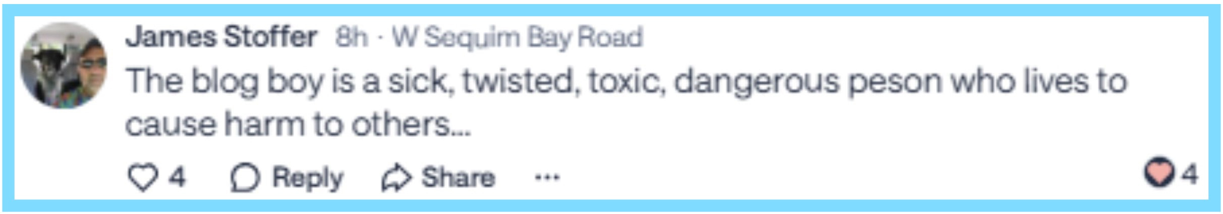 I’m gay, and I write a blog — not everyone agrees with my views. In fact, some of my readers believe that even gay people can do bad things. I’ve been called a bigot, a racist, a white supremacist, and a “sick, twisted, toxic, dangerous person who lives to cause harm to others” by one Clallam County elected official.